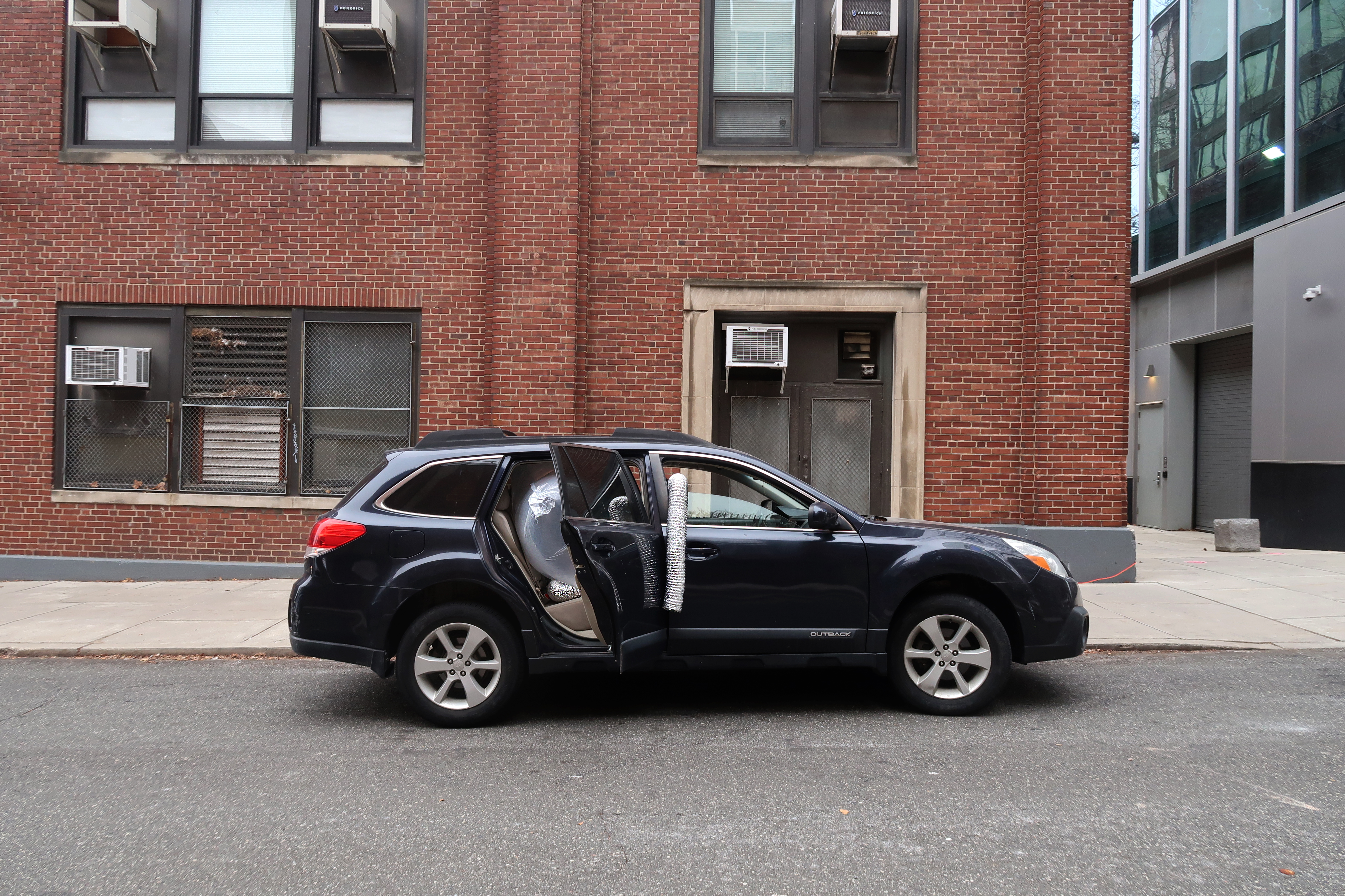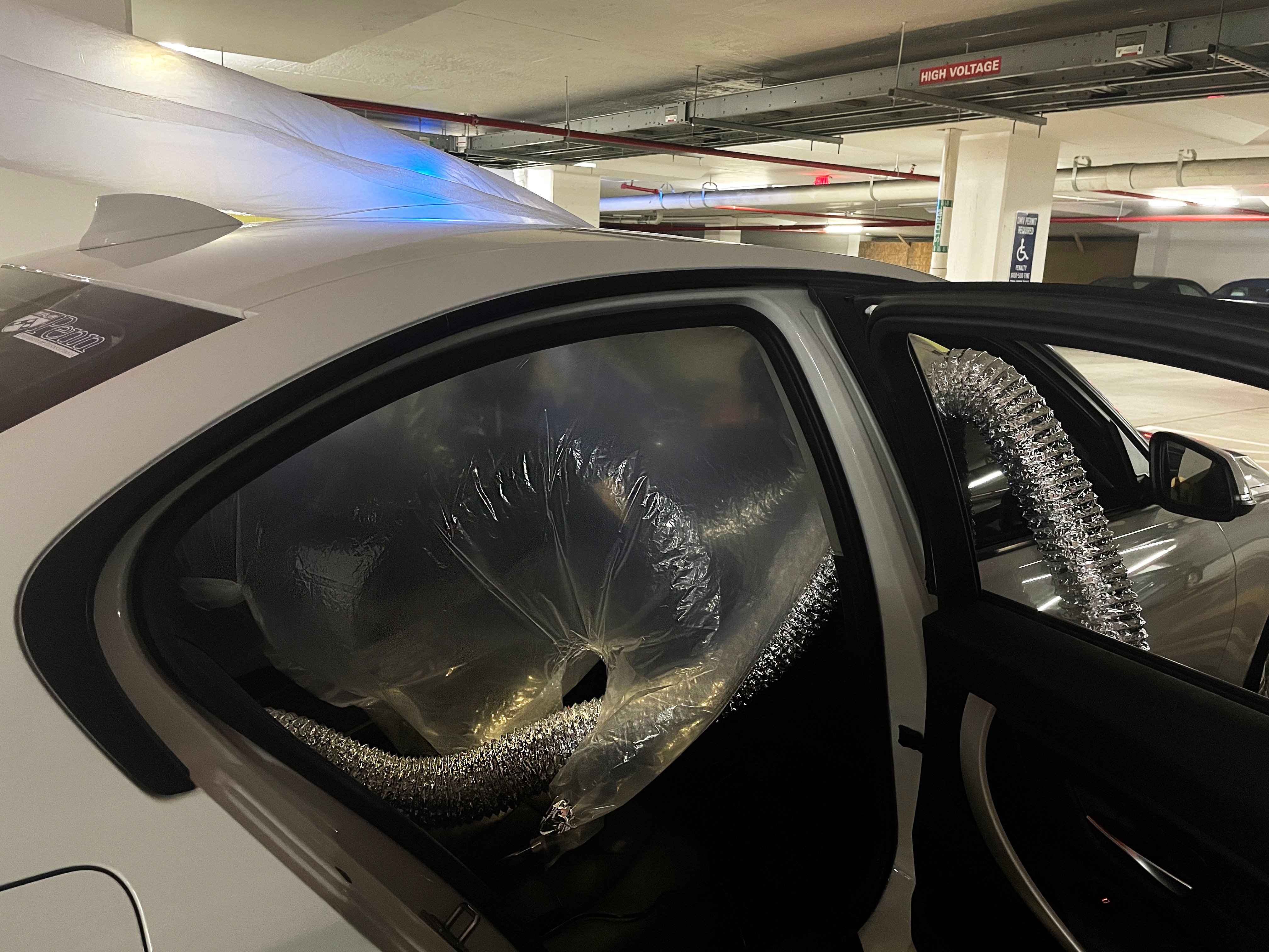 plastic tarp, dryer duct, sedan, duct tape, parking lot, car powered air pump